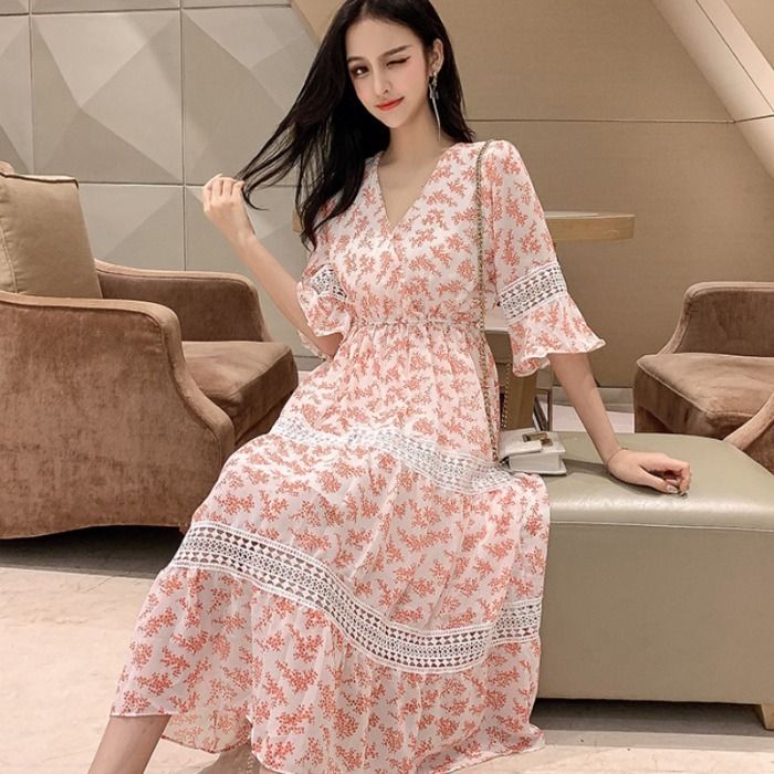 2020 Summer Pregnant Women Chiffon Dress Cross V Neck Stretched Waist Maternity Floral Lace Patchwork Chiffon Dress Sweet Beach Dress From Lin 02 37 71 Dhgate Com